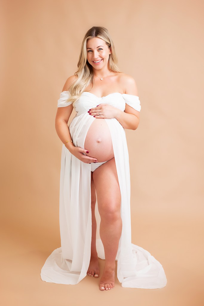 - 30 minute session with your choice of backdrop (White, Neutral, Grey, Tan). You are welcome to borrow the white maternity dress (featured above) or bring your own style outfit to the shoot.