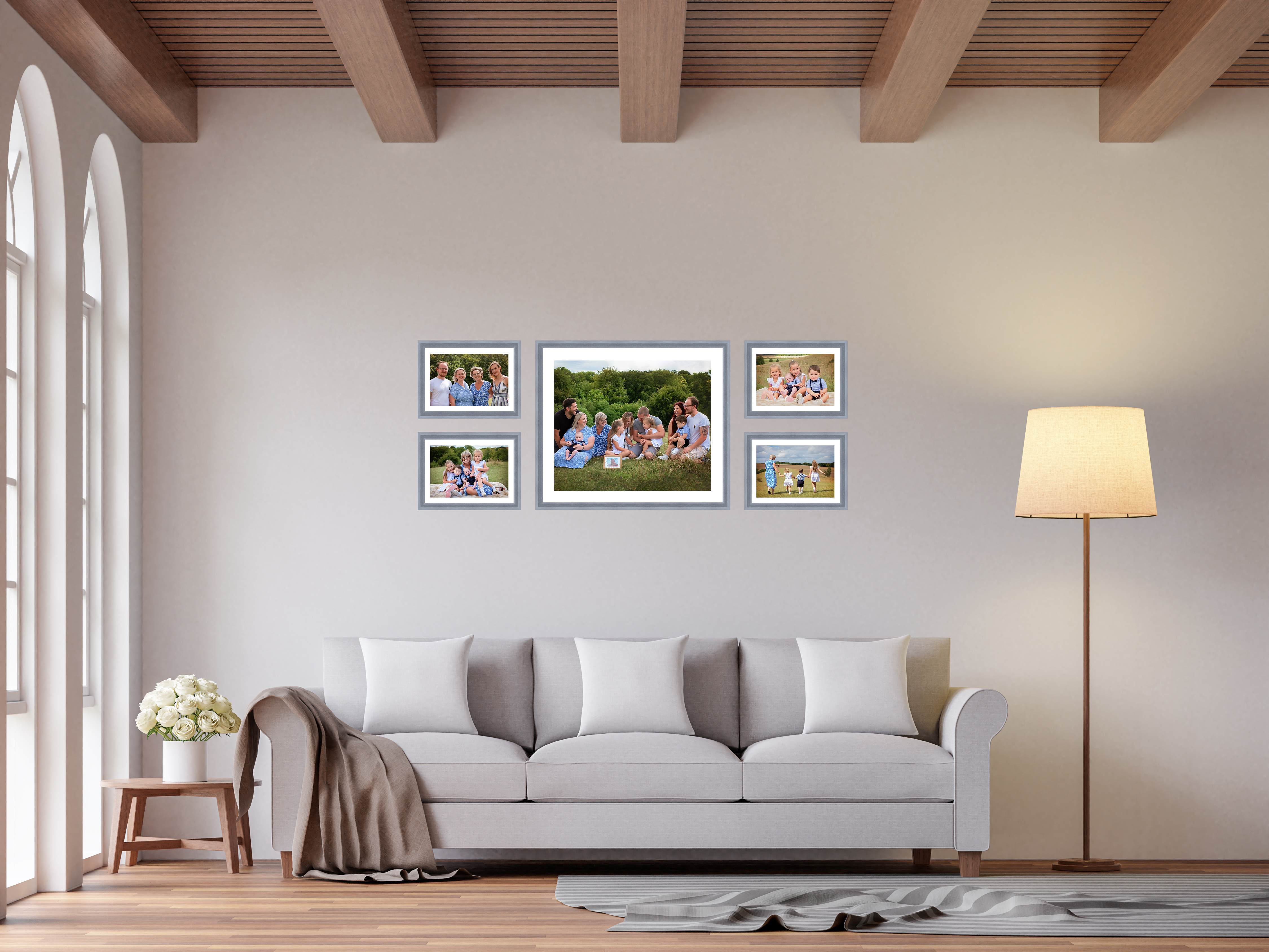 Scandinavian living room 3d rendering image.The Rooms have wooden floors and ceilings with white walls and arch windows.The room is furnished with light grey fabric sofas.